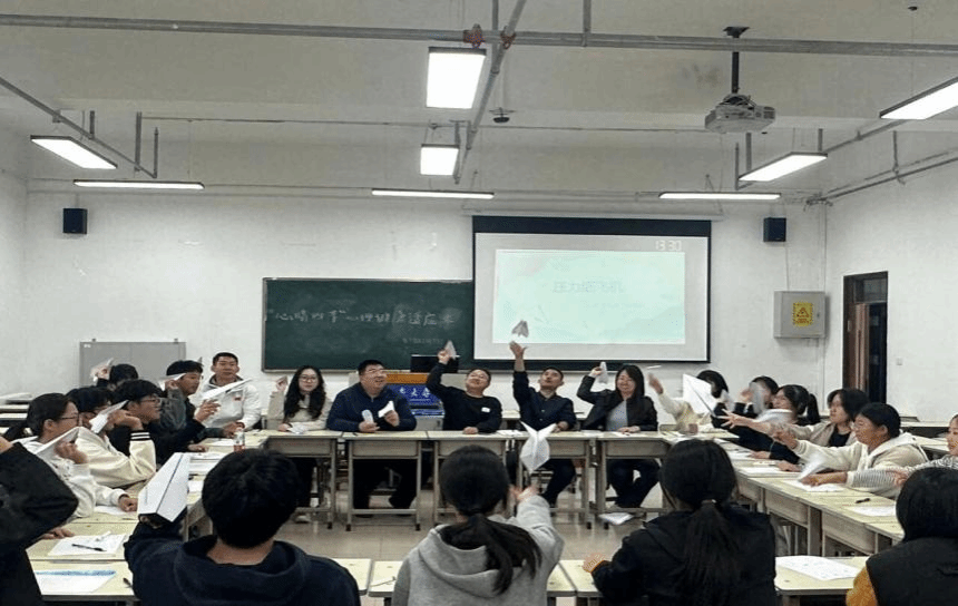 活动现场,同学们首先在便签纸上写下近期困扰自己的烦恼与压力,随后将纸张细心叠成纸飞机。随着一声令下,大家纷纷将承载着压力的纸飞机奋力掷向空中,白色的纸飞机在空中划出一道道弧线,象征着将内心的焦虑与负担尽情释放。放飞环节结束后,郝文晴老师随机抽取了部分纸飞机,匿名念出其中的内容,涉及学业困惑、未来焦虑、人际关系等多个方面。同学们围绕这些问题展开热烈讨论,分享自己的经验与感悟,现场气氛温暖而积极,许多同学表示在交流中获得了启发与力量。